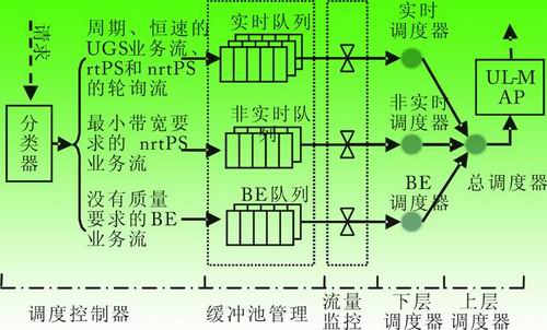四種類型業(yè)務(wù)的帶寬請求方式不同,對時(shí)延、抖動和速率等參數(shù)的要求也不同。考慮到無線信道特性,采用如下調(diào)度控制策略:為UGS業(yè)務(wù)預(yù)留一定帶寬BUGS,維持特征表,用于定期給SS分配相應(yīng)的帶寬來發(fā)送UGS業(yè)務(wù)流。對于rtPS業(yè)務(wù),通過確定其單播輪詢間隔的參數(shù)值,可以調(diào)整實(shí)時(shí)業(yè)務(wù)傳輸機(jī)會的多寡和帶寬分配量。對于nrtPS業(yè)務(wù),通過確定其單播輪詢間隔來調(diào)整獲取傳輸機(jī)會的周期,保證非實(shí)時(shí)業(yè)務(wù)的最小速率。并檢查帶寬的空余量,決定是否對nrtPS業(yè)務(wù)的競爭和捎帶請求進(jìn)行授權(quán)。按照上述思想,將周期性的、具有恒定速率的UGS業(yè)務(wù)流、rtPS和nrtPS的輪詢流放至實(shí)時(shí)隊(duì)列,將nrtPS業(yè)務(wù)流的帶寬請求放至非實(shí)時(shí)隊(duì)列,而將沒有QoS要求的BE業(yè)務(wù)流放至BE隊(duì)列。