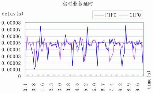 圖 3是UGS、rtPS等實(shí)時(shí)業(yè)務(wù)在采用CIFQ算法和FIFO算法時(shí)的延時(shí)對比??梢钥闯?,在業(yè)務(wù)擁擠,出現(xiàn)信道錯(cuò)誤時(shí),F(xiàn)IFO算法會產(chǎn)生峰值毛刺,出現(xiàn)長延時(shí)現(xiàn)象。相比之下,雖然CIFQ算法的總延時(shí)增加2%,但延時(shí)波動較為平穩(wěn),且無長延時(shí)現(xiàn)象,這證明CIF-Q算法能夠在有效應(yīng)對信道錯(cuò)誤的同時(shí),滿足了實(shí)時(shí)業(yè)務(wù)的延時(shí)和抖動需求。
