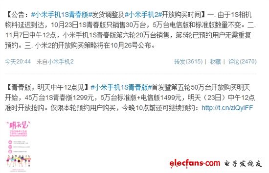 小米官方于10月18日公布了小米第五輪開放購買將同時發(fā)售小米手機1S青春版與小米手機1S標(biāo)準(zhǔn)版(含小米1S電信版),總共有45萬臺粘米手機1S青春版與5萬臺1S標(biāo)準(zhǔn)版(含電信版)。和以