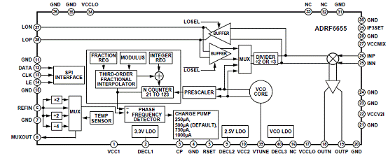 1 ADRF6655:集成小數(shù)N鎖相環(huán)和壓控振蕩器的寬帶上/下變頻混頻器