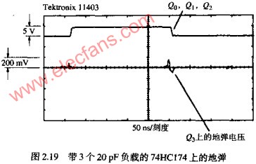 2881 圖2.17說明了地彈的情形。設想一個TTL D型八觸發(fā)器,由單一時鐘輸入,驅動一組32個存儲器的芯片組,以每條輸入線5PF計算,每條地址線的負載為160PF。