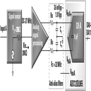 ADC12DL065模/數轉換器還有其他的優(yōu)點,工程師設計信號路徑的其他環(huán)節(jié)時,應該詳細考慮這些 重要的技術參數。這里首先要介紹的是這款模/數轉換器的輸入信號的特性。這款芯片的整個差分信號輸入范圍是 2 Vpp,共模輸入電壓是 1.5 伏 (V),而輸入電容是 8pF (參看圖 3)。此外,ADC12DL065 模/數轉換器的交流電特性也絕不遜色,不但信噪比極高,而且以 30MHz 的輸入信號來說,無雜散信號動態(tài)范圍 (SFDR) 可達 85dB,確保模/數轉換器所產生的假信號遠比要接收的信號小。雙路模/數轉換器的另一優(yōu)點是芯片內的兩條通道可以產生互動作用。換言之,ADC12DL065 模/數轉換器的兩條輸入通道可以互相抑制來自對方的信號干擾,而且兩者之間的信號抑制率高達 90dB,因此兩條通道的信號不會互相干擾。