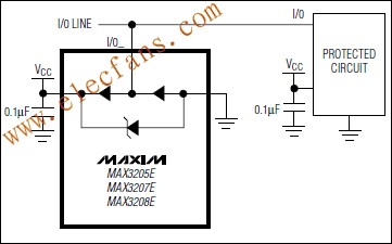 33 MAX13202E/MAX13204E/MAX13206E/MAX13208E低電容±30kV ESD保護(hù)二極管陣列用于保護(hù)通信線路的敏感電子器件,其每一個通道包括一對兒二極管,用于將ESD電流脈沖旁路到VCC或GND。MAX132