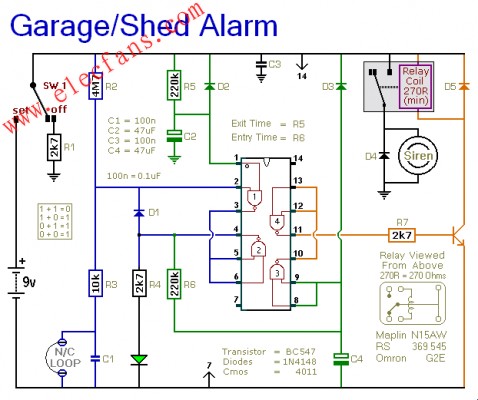 這是一個(gè)簡(jiǎn)單的車(chē)庫(kù)/大棚報(bào)警的增強(qiáng)版本。進(jìn)入和退出的延誤已增加至約30秒- 我增加了一個(gè)定時(shí)警報(bào)器切斷和自動(dòng)