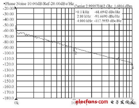25 1.8 V的供電電壓下,鎖相環(huán)功耗為7.2 mW。在偏移載波頻率200 kHz處,環(huán)路的帶內(nèi)噪聲為-124 dBc/Hz。