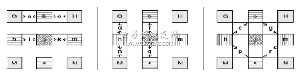 減小算法的存儲器需求,減少中間結(jié)果的存儲需求,可縮減片外存儲器訪問次數(shù),提高應(yīng)用的實(shí)時(shí)性能。下面主要討論降低H.264 INTRA幀編碼的運(yùn)算復(fù)雜性和存儲器需求的方法。圖1 H.264編碼器的結(jié)構(gòu)流程圖 圖2