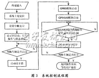 控制部分的流程是這樣的:首先將操作系統(tǒng)下載到目標(biāo)板,目標(biāo)板初始化,并且設(shè)置各個(gè)模塊的中斷向量來保證各個(gè)模塊啟動(dòng)后能夠正確運(yùn)行。中斷優(yōu)先級(jí)的排序是讀卡器優(yōu)先級(jí)最高,其次是GPRS,最后是GPS。同時(shí),顯示屏顯示操作界面,用戶可以輸入指令使得汽車啟動(dòng)。當(dāng)車輛啟動(dòng)后,各模塊也隨之運(yùn)行,系統(tǒng)程序?qū)⑥D(zhuǎn)入查詢狀態(tài),通過不斷掃描UART端口判斷是否有標(biāo)簽進(jìn)入識(shí)別區(qū)域。若進(jìn)入標(biāo)簽識(shí)別區(qū)域,讀卡器就會(huì)接收到射頻模塊識(shí)別到的條碼信號(hào),判斷信號(hào)正確后,系統(tǒng)轉(zhuǎn)人中斷子程序。在中斷子程序中,系統(tǒng)會(huì)向GPIO端口提供相應(yīng)的高低電平作為輸出信號(hào)來實(shí)現(xiàn)轉(zhuǎn)向。GPRS是隨著車輛啟動(dòng)后就立即啟動(dòng)的,這是因?yàn)樗仨毑粩喔卤O(jiān)控中心提供的路徑信息來保證車輛的正常行駛。當(dāng)車輛停止時(shí)會(huì)發(fā)出電平信號(hào),此時(shí),系統(tǒng)轉(zhuǎn)入等待狀態(tài),屏幕顯示操作界面,等待用戶進(jìn)行下一步操作。