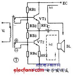 易于說(shuō)明,先介紹一個(gè)有輸入變壓器沒(méi)有輸出變壓器的 OTL 電路,如圖 7 。