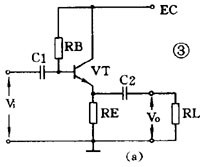 圖 3 ( a )是一個(gè)射極輸出器。它的輸出電壓是從射極輸出的。圖 3 ( b )是它的交流通路圖,可以看到它是共集電極放大電路。