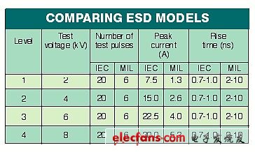 確保IC不受損壞。在為給定的應(yīng)用選擇最佳保護(hù)器件的時候,設(shè)計工程師們必須要考慮到ESD保護(hù)器件能夠把ESD電壓控制到多么低的電平。 圖1:IEC61000-4-2規(guī)范指標(biāo)一覽表。 選擇最有效的保護(hù)方案