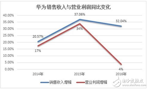 華為的整體銷售收入在2016年同比增長了32%,但其營業(yè)利潤的同比增幅則僅有3.8%。這一趨勢從下圖銷售收入與營業(yè)利潤三年間的同比變化可以看到清晰的展現(xiàn),但2016年的差距之大還是出人意料。