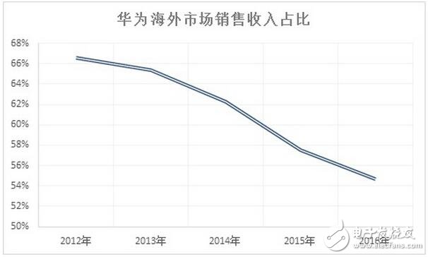 作為本土企業(yè)稱雄國際市場的代表,華為在170多個國家開展業(yè)務(wù)的國際化戰(zhàn)略一直受到推崇,其海外市場銷售占比超過國內(nèi)市場也是華為全球化運營成功的標(biāo)志。但從下圖五年間華為海外市場銷售收入占比的變化趨勢來看,海外市場銷售占比一直處于連續(xù)下滑狀態(tài),特別是2016年的占比回落到55%,如果這一趨勢沒有扭轉(zhuǎn)的話華為的海外銷售收入將很快被國內(nèi)反超。