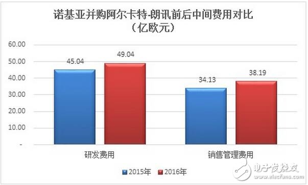 具體來看,影響經(jīng)營利潤的中間費用高企是最主要的原因。從下圖諾基亞并購前后中間費用對比情況表來看,諾基亞在2016年并購阿爾卡特-朗訊后的研發(fā)費用和銷售管理費用相比與2015年兩家的總和各有10%左右的上升,由于諾基亞在2016年的收入比并購前兩家的總和有12%的下降,因此研發(fā)費用在2016年業(yè)務(wù)收入中的占比高達(dá)21%,為四大通信廠商中最高;銷售管理費用占比達(dá)到16%,四大通信廠商中僅次于華為。由此可以看出,諾基亞在并購?fù)瓿傻牡谝荒赀€沒有實現(xiàn)協(xié)同效用,如何處理重合的產(chǎn)品線和冗余的人員仍是諾基亞必須要面對的整合之痛。