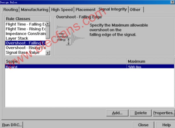 包含電源網(wǎng)絡(luò)設(shè)計(jì)規(guī)則,指定每個電源網(wǎng)絡(luò)和電壓。從“Rule Classes”中選“Overshoot Falling Edge”點(diǎn)擊“Add”,在談出對話框中選擇“Fiter Kind”設(shè)為“Whole Board”,并且改變右側(cè)“Maximum(Volts)”為“0.5”,點(diǎn)取“OK”,存入這條規(guī)則。重復(fù)剛才的步驟,設(shè)置“Undershoot-Falling Edge”,兩個強(qiáng)制信號完整性規(guī)則。