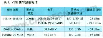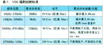 vde和cispr兩個(gè)標(biāo)準(zhǔn)及測試條件基本相同。vde傳導(dǎo)放射標(biāo)準(zhǔn)和輻射標(biāo)準(zhǔn)分別見表4和表5。表4中l(wèi)isn表示線路阻抗穩(wěn)定網(wǎng)路(line impedance stabilization network),vde和cispr測傳導(dǎo)放射時(shí),vde和cispr采用有別于fcc的lisn電路,其輸入阻抗為150 ;而fcc采用的lisn電路,輸入阻抗為50 。vde和cispr規(guī)定傳導(dǎo)測試下限頻率為10khz,而fcc規(guī)定為450khz,這三種標(biāo)準(zhǔn)規(guī)定上限頻率都是30mhz。輻射測試頻率范圍,vde和cispr規(guī)定為10khz~1000 mhz;而fcc規(guī)定為30mhz~1000 mhz。