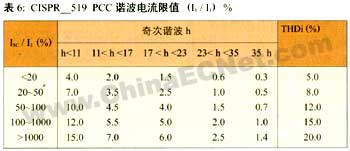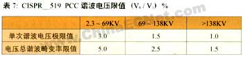 表6列出了cispr標(biāo)準(zhǔn)中有關(guān)電力電子裝置和其他非線性負(fù)載用戶,允許注入電網(wǎng)的諧波電流限值。該表適合于電壓等級為2.4~69kv,其中isc / i1 為公共連接點(diǎn)(pcc) 短路電流與基波電流之比,偶次諧波限值為表6中奇次諧波限值的25%,ih / i1為第h次諧波電流與基波電流之比。表7為供電電網(wǎng)須保證電壓波形質(zhì)量的諧波電壓限值,不僅適用于三相系統(tǒng),也適用于單相系統(tǒng),其中vh / v1為第h次諧波電壓與基波電壓之比。現(xiàn)將表6、表7中有關(guān)定義說明如下。