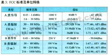 fcc 標(biāo)準(zhǔn)及單位轉(zhuǎn)換數(shù)據(jù)見表3(表中af表示天線系數(shù))。a類設(shè)備測試過程可以獨(dú)立于fcc而自行完成,但要提交測試結(jié)果, fcc保留了隨時(shí)抽樣測試的權(quán)力。只要懷疑設(shè)備不符合emi標(biāo)準(zhǔn),就要對設(shè)備進(jìn)行測試,并對廠家提交的測試結(jié)果進(jìn)行審查。對于b類設(shè)備,限制比較嚴(yán)格,必須提交一個(gè)樣品供測試使用。