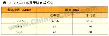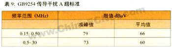 當(dāng)電氣設(shè)備使用場合已確定時(shí),該設(shè)備的emi標(biāo)準(zhǔn)就得按使用場合所在行業(yè)的emi標(biāo)準(zhǔn)來衡量。例如,某開關(guān)電源用在信息行業(yè),則這個(gè)開關(guān)電源就作為信息設(shè)備,使用信息行業(yè)emi標(biāo)準(zhǔn)來診斷,即引用gb9254(相當(dāng)于en5502)a或b級標(biāo)準(zhǔn)。對于gb9254傳導(dǎo)干擾a和b級標(biāo)準(zhǔn)分別見表9和表10。使用表9與表10時(shí),在過渡頻率(0.5mhz) 處應(yīng)采用較低的限值;使用表10時(shí),在0.15mhz~0.50mhz頻率范圍內(nèi),限值隨頻率的對數(shù)呈線性減小。