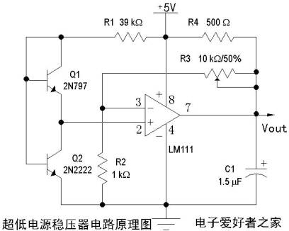 作二極管用的晶體管 2N797 是一只鍺管,而2N2222是一只硅管。其基準(zhǔn)電壓是由兩只管子的能隙電壓差產(chǎn)生的,其值大約為0.5V。LM111不是普通的運(yùn)算放大器,而是專門用來(lái)設(shè)計(jì)輸入電流非常低的電壓比較器。當(dāng)用5V電源供電時(shí),它的最低輸出電壓可調(diào)到0V。具有圖示結(jié)構(gòu)的電路,最低輸出電壓可調(diào)到接近500mV。整個(gè)穩(wěn)壓電路的溫度系數(shù)也非常低。