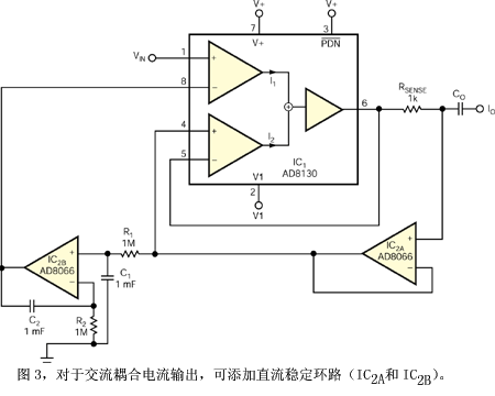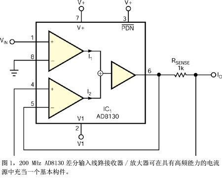 基于儀器和運(yùn)算放大器的傳統(tǒng) 電流源和電壓/電流轉(zhuǎn)換器在低頻下提供很高的輸出阻抗,這是因?yàn)?a href="http://m.greenbey.cn/tags/放大器/" target="_blank">放大器具有良好的低頻 CMRR(共模抑制比)。在較高頻率下,降低的 CMRR、固有的輸出電容、轉(zhuǎn)換率的局限性阻止了高質(zhì)量電流源的實(shí)現(xiàn)。Analog Devices 公司的兩款 200 MHz線路接收/放大 IC——AD8129 和 AD8130——提供了差分輸入和顯著的 CMRR,使它們成為構(gòu)建高頻恒流源的有力候選者。圖 1 中的電路提供了良好的起點(diǎn),但 AD8130 較高的輸入偏置電流可能會(huì)在電流電平較低時(shí)影響輸出電流精度。