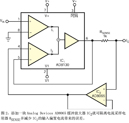 為了克服這個(gè)問題,可以添加一個(gè)單位增益緩沖器IC2來隔離電流傳感電阻器(圖 2)。另外,可以利用緩沖放大器來測量負(fù)載電壓并自舉輸出電纜的電容。該電路在1MHz時(shí)呈現(xiàn)的輸出阻抗約為500k ,并且利用±5V電源時(shí),電流達(dá)標(biāo)范圍是 0V至±3V 。