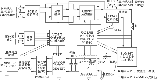 ??? 1)兩種直流輸出電壓和電流大不相同的3500W高檔電源(Vo、Io均相差7倍),其主功率變換電路的三大環(huán)節(jié)基本相同,即電網(wǎng)輸入濾波整流電路;PFC系統(tǒng)的Buck-Boost組合電路亦分段控制;全橋變換器移相式控制ZVS軟開(kāi)關(guān)電路。