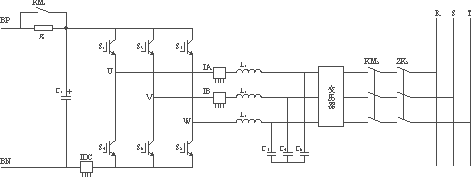 ??? 該主電路適用于三相電網(wǎng),而對(duì)于單相電網(wǎng)其主電路結(jié)構(gòu)類(lèi)似,但充放電電流脈動(dòng)較大。其BP端與BN端分別接蓄電池的正極和負(fù)極,電阻Rs為軟啟動(dòng)電阻,以防止在合閘瞬間由于濾波電容的初始零電壓,產(chǎn)生大的短路沖擊電流,在軟啟動(dòng)完畢后,接觸器KM1閉合,短路Rs。其電容的選擇與逆變器輸出額定功率、母線(xiàn)電壓有關(guān),若電容量選擇過(guò)小,逆變器直流母線(xiàn)電壓的波動(dòng)幅度將較大,同時(shí)也會(huì)引起大的蓄電池直流充放電電流脈動(dòng)。