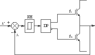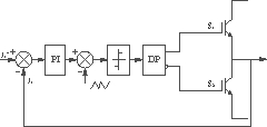 ??? 滯環(huán)PWM電流控制是一種較為傳統(tǒng)的控制方法,其結(jié)構(gòu)如圖3所示,DP為上下橋臂驅(qū)動(dòng)電路,KH為滯環(huán)比較器。滯環(huán)比較方式的特點(diǎn)是采用硬件電路比較,電路結(jié)構(gòu)簡(jiǎn)單,穩(wěn)定性好,電流控制的響應(yīng)很快,誤差可控,但輸出電流的諧波較多,電磁噪聲較大。