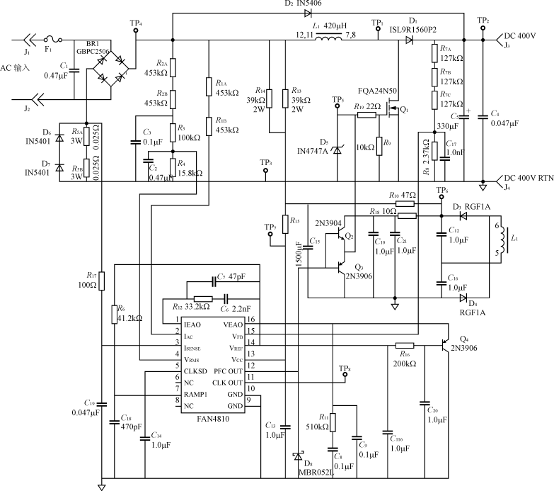 圖2??? 基于FAN4810的500WPFC預(yù)變換器電路