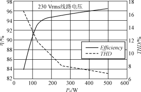 ??? 當(dāng)負(fù)載從50W逐步增加到500W時,變換器效率和THD變化曲線如圖3所示。圖4為AC輸入電流波形,圖5為PFC變換器輸入電壓(經(jīng)全波整流的AC線路電壓)和DC輸出電壓紋波波形。