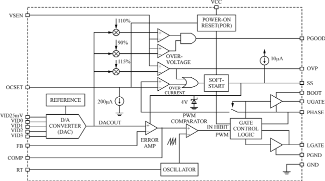 圖1??? 引腳排列 ??? 各引腳功能如下: ??? 腳1(VSEN)??? 電壓檢測(cè)腳,連接到變換器的輸出電壓端,PGOOD和OVP信號(hào),利用該信號(hào)來(lái)檢測(cè)輸出電壓的狀態(tài)和進(jìn)行過(guò)壓保護(hù); ??? 腳2(OCSET)??? 過(guò)流設(shè)定腳,用來(lái)設(shè)定過(guò)流保護(hù)值; ??? 腳3(SS)??? soft start,從該腳連接一個(gè)電容到地,設(shè)定變換器的軟啟動(dòng)間隔時(shí)間,也可用來(lái)作為變換器的使能端,開(kāi)啟/關(guān)閉變換器; ??? 腳4-腳8(VID25mV,VID0-VID3)??? 5位DAC的輸入腳,通過(guò)這5個(gè)腳可對(duì)內(nèi)部電壓參考(DACOUT)進(jìn)行編程,而DACOUT的輸出用來(lái)設(shè)定變換器的輸出電壓,同時(shí)也用來(lái)設(shè)定PGOOD和OVP的門(mén)檻電壓; ??? 腳9(COMP)??? 內(nèi)部誤差放大器的輸出,用來(lái)補(bǔ)償變換器的電壓反饋信號(hào); ??? 腳10(FB)??? 內(nèi)部誤差放大器的反相輸入,用來(lái)補(bǔ)償變換器的電壓反饋信號(hào); ??? 腳11(GND)??? 信號(hào)地; ??? 腳12(PGOOD)??? 電源好信號(hào),OC門(mén)輸出,用來(lái)指示變換器輸出電壓的狀態(tài);當(dāng)輸出電壓超出DACOUT參考電壓的±10%范圍時(shí),該信號(hào)變低,說(shuō)明電壓不正常; ??? 腳13(PHASE)??? 將其連到上端MOSFET的源極,用來(lái)監(jiān)視MOSFET的電壓降,從而實(shí)現(xiàn)過(guò)流保護(hù),同時(shí),它也是上端MOSFET門(mén)極驅(qū)動(dòng)的返回路徑; ??? 腳14(UGATE)??? 將其連到上端MOSFET的門(mén)極,提供門(mén)極驅(qū)動(dòng)信號(hào); ??? 腳15(BOOT)??? 提供上端MOSFET的偏置電壓; ??? 腳16(PGND)??? 功率地,將下端MOSFET的源極接該腳; ??? 腳17(LGATE)??? 將其連到下端MOSFET的門(mén)極,提供門(mén)極驅(qū)動(dòng)信號(hào); ??? 腳18(VCC)??? 芯片工作電壓輸入; ??? 腳19(OVP)??? 過(guò)壓輸出信號(hào); ??? 腳20(RT)??? 用來(lái)設(shè)置振蕩器的開(kāi)關(guān)頻率。 2.2??? 工作原理 ??? HIP6004E內(nèi)部框圖如圖2所示。它由數(shù)模轉(zhuǎn)換器,電壓參考,誤差放大器,振蕩器,PWM比較器,軟啟動(dòng)電路,過(guò)壓、過(guò)流保護(hù)電路,門(mén)極控制邏輯電路,上電復(fù)位電路等部分組成。