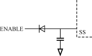 圖4??? 電壓反饋補(bǔ)償電路 ??? 反饋補(bǔ)償電路由內(nèi)部誤差放大器,ZIN阻抗網(wǎng)絡(luò),ZFB阻抗網(wǎng)絡(luò)組成。 ??? 以下詳細(xì)介紹電阻,電容參數(shù)的計(jì)算方法。 ??? 1)選擇R1的阻值,通常在2kΩ到5kΩ之間,一般定為3.3kΩ。 ??? 2)計(jì)算R2的阻值 ??? R2= 式中:DBW是希望的帶寬,一般為變換器開(kāi)關(guān)頻率的20%~30%; ??????????? ΔVOSC為HIP6004E的斜坡幅值(1.9V); ????? Vin為輸入電壓; ????? fLC= ??? 3)計(jì)算C2的值 ??? C2= ??? 4)計(jì)算C1的值 ??? C1= 式中:fESR= ??? 5)計(jì)算R3的值 ??? R3= 式中:fSW是變換器開(kāi)關(guān)頻率值。 ??? 6)計(jì)算C3的值 ??? C3= 3.5??? 遙控開(kāi)關(guān)機(jī)電路設(shè)計(jì) ??? 將腳3(SS)電壓拉低到1.2V以下即可關(guān)閉HIP6004E。可以通過(guò)圖5所示的簡(jiǎn)單方法實(shí)現(xiàn)遙控開(kāi)關(guān)機(jī)功能,當(dāng)ENABLE信號(hào)開(kāi)路時(shí)開(kāi)機(jī);當(dāng)ENABLE信號(hào)接地時(shí)關(guān)機(jī)。