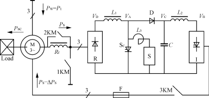 圖4??? 斬波式內(nèi)反饋調(diào)速裝置主電路原理圖 圖中:1KM、2KM、3KM—開關(guān),L1、L2、L3—電抗器,R—整流橋, I—逆變橋,S—關(guān)斷橋,Sc—斬波晶閘管,Rf—啟動(dòng)頻敏電阻,C—電容, D—逆阻二極管,F(xiàn)—保險(xiǎn),Load—電動(dòng)機(jī)負(fù)載。 ??? 該方法是在常規(guī)串級(jí)調(diào)速的直流回路中,加入并聯(lián)型直流斬波器。利用它對(duì)轉(zhuǎn)子整流后的直流電流進(jìn)行脈寬調(diào)制??刂茢夭ㄆ鞯恼伎毡染湍苷{(diào)節(jié)直流側(cè)的短路電流,從而間接地控制了反饋給調(diào)節(jié)繞組的轉(zhuǎn)差功率,達(dá)到調(diào)速的目的。關(guān)斷橋S的作用是關(guān)斷斬波晶閘管Sc。逆阻二極管D、電感L2和電容C起隔離緩沖作用。加入斬波器使逆變器的觸發(fā)角(β)不用調(diào)節(jié),且固定在很小的角度,這樣既大大提高了功率因數(shù),減少了諧波電流對(duì)電網(wǎng)的污染,提高了系統(tǒng)的可靠性,又使逆變器的容量小很多(逆變器的容量=0.148P1)。因此,它具有結(jié)構(gòu)簡(jiǎn)單、效率高、成本低、諧波幅值低的優(yōu)點(diǎn)。但它只能在同步轉(zhuǎn)速以下運(yùn)行,而且不能利用原有的電動(dòng)機(jī),需購(gòu)置專用的內(nèi)反饋電動(dòng)機(jī)(但卻省掉了昂貴的逆變變壓器)。在高電壓、大容量的水泵、風(fēng)機(jī)用繞線電動(dòng)機(jī)調(diào)速中,顯示出突出的優(yōu)勢(shì)。 2.2??? 改變極對(duì)數(shù)p的調(diào)速方法 ??? 通過改變定子繞組的接線來改變極對(duì)數(shù),就改變了同步轉(zhuǎn)速。它可以獲得恒轉(zhuǎn)矩調(diào)速特性和恒功率調(diào)速特性。這種方法效率高,操作筒單、成本低廉,機(jī)械特性硬。為得到好的調(diào)速精度與穩(wěn)定性,常用速度反饋的控制方式。缺點(diǎn)是有級(jí)調(diào)速。它和調(diào)壓調(diào)速結(jié)合起來形成“變極調(diào)壓調(diào)速”??梢源蟠蟾纳频退龠\(yùn)行性能,擴(kuò)大調(diào)速范圍。 2.3??? 改變頻率f的調(diào)速方法 ??? 變頻調(diào)速是用變頻電源改變電動(dòng)機(jī)定子繞組的頻率,從而改變同步轉(zhuǎn)速來實(shí)現(xiàn)調(diào)速。這種方法具有高效率、寬范圍和高精度的調(diào)速性能。規(guī)格系列齊全,可以滿足各種不同需求,因而被廣泛采用,是最具發(fā)展前途的理想調(diào)速方法。它可分為兩大類: ??? 1)交-直-交變頻調(diào)速電網(wǎng)中的交流電先被整流成直流電,再通過逆變器逆變?yōu)轭l率可調(diào)的交流電。根據(jù)直流濾波方式不同,又分為電壓型(電容器濾波)和電流型(電感濾波)兩種。 ??? 2)交-交變頻調(diào)速由于它只有一級(jí)功率變換,省去了直流環(huán)節(jié),減少了損耗,進(jìn)一步提高了效率。也因此結(jié)構(gòu)復(fù)雜、額定工作頻率較低,造價(jià)較高。但它能夠提供比較逼近正弦的交流電流,可以四象限運(yùn)行,常用于大容量的交流調(diào)速設(shè)備中(國(guó)外單臺(tái)變頻裝置容量已超過10MW)。變頻調(diào)速的不足之處是造價(jià)較高、結(jié)構(gòu)復(fù)雜、低速時(shí)功率因數(shù)低、諧波較大。 3??? 調(diào)速性能分析 ??? 通過半導(dǎo)體電力變流器對(duì)電動(dòng)機(jī)的電壓、頻率、功率進(jìn)行調(diào)節(jié)來實(shí)現(xiàn)調(diào)速,雖具有轉(zhuǎn)換效率高的優(yōu)點(diǎn),但也具有功率因數(shù)低、諧波電流大的缺點(diǎn)。所以,提高調(diào)速效率、提高功率因數(shù)、減少高次諧波、提高性能價(jià)格比始終是人們關(guān)注的重點(diǎn)。 3.1??? 調(diào)速效率 ??? 圖5是異步電動(dòng)機(jī)能量流圖。其中P2和PSC之間的功率差PS,即轉(zhuǎn)差功率是上述幾種節(jié)能調(diào)速的著眼點(diǎn)。