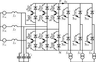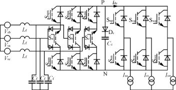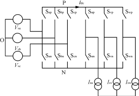 圖 4 等 效 的 矩 陣 變 換 器 拓 撲 Fig.4 Equivalent matrix converter topology ??? 實(shí)際應(yīng)用中,由于輸入端是電壓源供電,不能短路;感性負(fù)載時(shí),輸出端不能開路,即是在變換器工作過程中,同一輸出線上的三個(gè)開關(guān)中,必須且只能有一個(gè)開關(guān)閉合,所以開關(guān)函數(shù)還必須滿足式(3) Sak+Sbk+Sck=1,(k∈P,N)(3) ??? 根據(jù)圖4,利用附加的中間量VP, VN(以O(shè)點(diǎn)為參考點(diǎn)),可將式(1)轉(zhuǎn)化為如下方程: