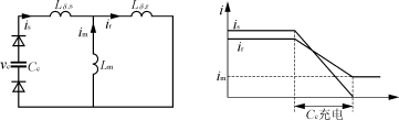 ??? 當(dāng)變換器啟動(dòng)后,電網(wǎng)側(cè)開關(guān)導(dǎo)通,箝位電容Cc被充電,直至其兩端的電壓達(dá)到線電壓峰值為止。在正常情況下,箝位電容電壓比Vdc大,因此箝位二極管Dc反向截止,箝位電路不工作。當(dāng)發(fā)生故障時(shí),如前所述變換器的全部開關(guān)立刻斷開,存儲(chǔ)在負(fù)載電感中的能量轉(zhuǎn)移到箝位電容。所以只要箝位電容值合適選取,裝置的過壓就可以避免。 3.2? 矩陣變換器中箝位電路的參數(shù)選擇 ??? 如果負(fù)載為雙饋電機(jī),發(fā)生故障時(shí),箝位二極管導(dǎo)通,箝位電容和電機(jī)的輸入端相連,但是電壓極性相反,因此切斷電機(jī)。箝位電容通過箝位二極管充電,此時(shí)它與負(fù)載連接的等效電路如圖9(a)所示。圖中的Lδs是定子漏感,Lδr是轉(zhuǎn)子漏感,而Lm是電機(jī)的勵(lì)磁電感;is,ir,im則分別是定子電流,轉(zhuǎn)子電流和勵(lì)磁電流;Cc即是箝位電容。 ??? 初始箝位電壓Vc0等于輸入網(wǎng)壓的峰值。在電感放電過程中,假設(shè)勵(lì)磁電流保持不變。轉(zhuǎn)子電流從初始值ir減小到勵(lì)磁電流im,箝位二極管則一直保持導(dǎo)通,直到定子電流is減小到0,也就是ir=im的時(shí)刻,如圖9(b)所示。因此傳輸?shù)襟槲浑娐返目偰芰喀?I>Qmotor可以按下式計(jì)算。