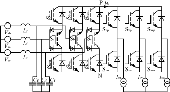 圖 6 簡 化 開 關(guān) 數(shù) 目 的 步 驟 Fig.6 Steps to reduce the switch number ??? 這樣,便可以得到簡化的具有15個(gè)單向開關(guān)的矩陣變換器拓?fù)?,如圖7所示。該結(jié)構(gòu)與圖5所示的拓?fù)湎啾容^,應(yīng)用場合類似,也具有相同的功能。比如,可以進(jìn)行四象限操作,實(shí)現(xiàn)雙向流動(dòng),諧波容量低,功率因數(shù)接近1等等。其主要的區(qū)別在于,當(dāng)中間直流環(huán)節(jié)的電流idc大于0時(shí),對于圖7所示的拓?fù)?,其電網(wǎng)側(cè)開關(guān)Sa,Sb,Sc的導(dǎo)通損耗會(huì)增加。