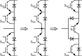 圖 6 簡 化 開 關(guān) 數(shù) 目 的 步 驟 Fig.6 Steps to reduce the switch number ??? 這樣,便可以得到簡化的具有15個(gè)單向開關(guān)的矩陣變換器拓?fù)?,如圖7所示。該結(jié)構(gòu)與圖5所示的拓?fù)湎啾容^,應(yīng)用場合類似,也具有相同的功能。比如,可以進(jìn)行四象限操作,實(shí)現(xiàn)雙向流動(dòng),諧波容量低,功率因數(shù)接近1等等。其主要的區(qū)別在于,當(dāng)中間直流環(huán)節(jié)的電流idc大于0時(shí),對于圖7所示的拓?fù)洌潆娋W(wǎng)側(cè)開關(guān)Sa,Sb,Sc的導(dǎo)通損耗會(huì)增加。