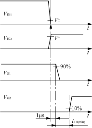 圖2??? SKHI21/SKHI22的內(nèi)部結(jié)構(gòu)及工作原理框圖 2.2??? 輸出引腳 ??? 引腳S1(VCE2)和引腳S20(VCE1)??? 被驅(qū)動(dòng)IGBT集-射極間壓降或被驅(qū)動(dòng)MOSFET漏?源極間壓降監(jiān)視電壓輸入端。使用中分別接被驅(qū)動(dòng)半橋IGBT的集電極或MOSFET漏極。由于SKHI21/22內(nèi)部已有高壓快恢復(fù)二極管,所以使用中不需再串高壓快恢復(fù)二極管。 ??? 引腳S6(CCE2)和引腳S15(CCE1)??? 2個(gè)被驅(qū)動(dòng)功率開關(guān)器件欠飽和保護(hù)門檻設(shè)置端。使用中分別通過一個(gè)電阻與電容的并聯(lián)網(wǎng)絡(luò)接被驅(qū)動(dòng)IGBT的發(fā)射極或功率MOSFET的源極。 ??? 引腳S9(E2)和引腳S12(E1)??? 輸出驅(qū)動(dòng)信號(hào)參考地端。使用中分別接被驅(qū)動(dòng)的2個(gè)IGBT的發(fā)射極或功率MOSFET的源極。 ??? 引腳S7(GON2)和引腳S14(GON1)??? 2驅(qū)動(dòng)脈沖信號(hào)輸出端。使用中分別通過一個(gè)適當(dāng)?shù)碾娮杞颖或?qū)動(dòng)的IGBT或功率MOSFET的柵極。 ??? 引腳S8(GOFF2)和引腳S13(GOFF1)??? 被驅(qū)動(dòng)功率開關(guān)器件關(guān)斷速度設(shè)置端。使用中,分別通過一個(gè)電阻接被驅(qū)動(dòng)的IGBT或MOSFET的柵極。 2.3??? 空引腳 ??? 輸入引腳中的P1,P2,P3,P4,P5,P6與輸出引腳中的S2,S3,S4,S5及S16,S17,S18,S19均為空腳,使用中懸空。 3??? 內(nèi)部結(jié)構(gòu)和工作原理 ??? SKHI21/SKHI22的內(nèi)部結(jié)構(gòu)和工作原理框圖如圖2所示。它們的內(nèi)部集成有2個(gè)施密特觸發(fā)器、2個(gè)與門、2個(gè)隔離環(huán)節(jié)、2個(gè)電平匹配器、2個(gè)功率驅(qū)動(dòng)級(jí)、2個(gè)過電流檢測(cè)比較器、1個(gè)輸入電源電壓監(jiān)視及1個(gè)誤差監(jiān)視網(wǎng)絡(luò),共有8個(gè)單元電路。 ??? 1)脈沖隔離驅(qū)動(dòng)功能??? 作為驅(qū)動(dòng)器,隔離驅(qū)動(dòng)是它的基本功能。當(dāng)信號(hào)經(jīng)VIN1、VIN2進(jìn)入驅(qū)動(dòng)器后,先經(jīng)過輸入施密特觸發(fā)器對(duì)脈沖進(jìn)行整形,此觸發(fā)器有較大的閾值電壓回差(VIN+=12.9V,VIN-=2.1V),因此具有較強(qiáng)的抗干擾能力。整形后的脈沖經(jīng)一與門后進(jìn)入隔離變壓器一次側(cè),在其二次側(cè)得到與輸入脈沖同相的驅(qū)動(dòng)信號(hào),具體傳輸特性如圖3所示。由于采用了隔離變壓器技術(shù),整個(gè)驅(qū)動(dòng)器用一路電源即可將兩路脈沖信號(hào)進(jìn)行隔離驅(qū)動(dòng)。同樣,多路信號(hào)也可以只用一路電源,選用多個(gè)SKHI21/SKHI22驅(qū)動(dòng)器即可完成隔離驅(qū)動(dòng)功能。 ??? 整個(gè)驅(qū)動(dòng)器采用了模塊封裝形式,可以同時(shí)驅(qū)動(dòng)兩路信號(hào)。只用一路時(shí),如使用輸出1,將輸出2的VCE2(S1)端和E2(S9)端短接。 ??? 2)內(nèi)鎖電路??? 內(nèi)部具有雙IGBT互鎖電路,以防止兩路信號(hào)同時(shí)為開態(tài),1路IGBT的關(guān)信號(hào)與另1路IGBT的開信號(hào)互鎖的典型時(shí)間tTD=2.7μs,可避免IGBT半橋直通,如圖3所示。