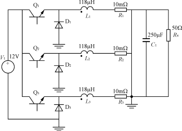 圖5? 單元滑模面產(chǎn)生原理圖 ??? 顯而易見,滑模面的個數(shù)和并聯(lián)單元的個數(shù)一致,這種控制電路比前一種會稍復(fù)雜些,但系統(tǒng)穩(wěn)定性提高。并且當變換器并聯(lián)單元的個數(shù)n發(fā)生改變時(n≤3),使用此滑模面時控制信號依然能自動交錯。此外,各個單元互不影響,一個單元發(fā)生故障不會導(dǎo)致整個系統(tǒng)的崩潰。 ??? 此滑模面應(yīng)用于并聯(lián)buck變換器中,其電路圖及交錯運行仿真波形如圖6所示。