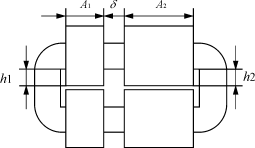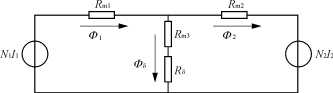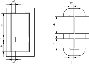 設初級繞組線徑為d1,次級繞組線徑為d2,則d1=1.13(cm)(5)d2=1.13(cm)(6) 式中:n為變壓器變比N1/N2; j為電流密度(A/cm2)。如功率相當?shù)钠胀娫醋儔浩骺蛰d磁感應強度為B01,電流密度為j1,漏磁變壓器的空載磁感應強度為B0,則漏磁變壓器的電流密度可按j=j1估算。 E型及C型變壓器的外型如圖2及圖3所示。 3.4漏抗計算漏感LS=10-8(H)(7)其中,lMCT=;hCT= 式中:δ為初、次級繞組之間的間隔距離(cm); A1,A2為初、次級繞組高度(cm); lM1,lM2為初、次級繞組平均匝長(cm); h1,h2為初、次級繞組厚度(cm)。 則漏抗XS=2πfLS(Ω)(8) 3.5負載電流核算I2H=(A)(9) 式中:E2為負載時變壓器次級感應電壓(V); r2為變壓器次級直流銅阻(Ω); RL為變壓器穩(wěn)定負載電阻(Ω); XL為變壓器負載電抗(Ω)。 3?6參數(shù)調(diào)整方法 1)結構調(diào)整 降低繞組高度,增加繞組厚度,增大初級與次級繞組之間的間隔距離均能增大漏抗;反之,可減小漏抗。 2)圈數(shù)調(diào)整 增加圈數(shù)可增大漏抗;反之,可減小漏抗。 4有磁分路的漏磁變壓器設計 4?1磁分路截面積的確定 1)初級磁通Φ1、次級磁通Φ2的確定 圖4為有磁分路的漏磁變壓器的磁路計算圖。Φ1=(Wb)(10)Φ2=(Wb)(11) 2)磁分路截面積的確定 磁分路截面積的選擇以磁分路磁感應強度Bδ小于鐵芯飽和磁感應強度為原則,一般可取Bδ≈B0;截面積由下式確定Sδ=(m2)(12) 4?2磁分路氣隙的確定 在圖4中,因為磁阻Rm2、Rm3?Rδ,所以可認為降落在氣隙上的磁壓等于次級繞組的磁勢。則磁分路氣隙lδ可由下式確定lδ=(m)(13) 因為氣隙周圍漏磁的存在,實際lδ應取稍大一些。 5結語 電源類產(chǎn)品設計是否合理,主要看電源和負載是否匹配;因此負載特性的準確測量是設計的關鍵。在以往的漏磁變壓器設計中,有些電路模型將負載簡單地由電阻代替,是很不合理的。應測量出負載的特性曲線,找出工作點的參數(shù),以此為依據(jù),才能設計出較合理的產(chǎn)品。 參考文獻 [1]徐安武.電感器件設計與計算[M].四川科技出版社,1985. [2]今朝.關于限流變壓器設計方法的論述[J].電子變壓器 技術,1990(3):5~8 |