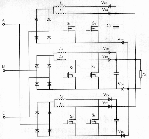 以單相Cuk型變換器合成三相功率因數(shù)校正電路為研究對象,將三相交流電分成單相A-B、B-C、C-A進(jìn)行功率因數(shù)校正,運(yùn)用升壓型平均電流控制的功率因數(shù)校正思想,解決了常規(guī)單相Cuk型有
