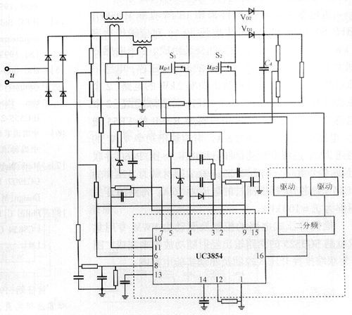 為了提高系統(tǒng)的功率因數(shù),整流環(huán)節(jié)不能采用二極管整流,采用了UC3854A/B控制芯片組成功率因