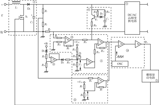 圖2快速起動(dòng)點(diǎn)亮供電電路總體框圖 本文介紹一種快速點(diǎn)亮汽車用金鹵燈的供電電路;它克服了上述一般點(diǎn)亮電路的缺點(diǎn),可在0.3s內(nèi)使燈的光輸出達(dá)到現(xiàn)用的鹵鎢燈的水平,在3s~5s內(nèi)燈的光輸出達(dá)到其額定值。 2快速起動(dòng)點(diǎn)亮供電電路 2.1快速起動(dòng)點(diǎn)亮供電電路原理 快速起動(dòng)點(diǎn)亮供電電路原理框圖可參見圖2,該點(diǎn)亮電路由12V蓄電池供電,電源電壓E經(jīng)燈開關(guān)K及繼電器觸點(diǎn)Jɑ后,一路通過二極管D1到端子B,供電給后級(jí)控制電路;另一路供給DC電壓提升電路②,把輸入電池電壓E提升后,再經(jīng)DC/AC高頻變換電路③,變成高頻正弦交流電壓供點(diǎn)亮金鹵燈。 電路③的輸出經(jīng)過變壓器T1的次級(jí)繞組T1-2,接到金鹵燈H的電極。電容C1和變壓器T1次級(jí)繞組T1-2的漏感構(gòu)成限流電路。電容C1還用來檢測金鹵燈電流,以判斷金鹵燈是否接通。當(dāng)燈處于未點(diǎn)亮狀態(tài)時(shí),燈點(diǎn)亮起動(dòng)電路⑦發(fā)出信號(hào)給燈點(diǎn)亮電路④,使之產(chǎn)生點(diǎn)亮脈沖。 控制電路⑧產(chǎn)生控制脈沖PS,其占空比是根據(jù)電路②的輸出電壓和輸出電流檢測電阻R3上的電壓信號(hào)的變化進(jìn)行調(diào)整的,然后,通過柵極驅(qū)動(dòng)電路⑤把該脈沖信號(hào)PS加到電路②以控制其輸出電壓。 控制電路的工作過程如下: 在燈點(diǎn)亮后,即刻又關(guān)斷,此時(shí),電路②的輸出電壓為零。再起動(dòng)時(shí),電路②的輸出電壓為高電平。從關(guān)斷到再起動(dòng)之間的時(shí)間間隔長短可由電路②輸出端的“零電平”與“高電平”之間的時(shí)間間隔來檢測。這可通過定時(shí)電路⑥來完成。電路⑥檢測出此時(shí)間間隔信號(hào),并把此信號(hào)傳送給電路⑧,電路⑧輸出相應(yīng)的控制信號(hào)給電路②,使其輸出電平改變,最終達(dá)到燈的恒功率控制。如果在燈點(diǎn)亮后,立即進(jìn)行恒功率控制,會(huì)大大縮短燈的起動(dòng)時(shí)間。 當(dāng)電源E的端電壓跌落到低于預(yù)定值時(shí),就由電壓降落檢測電路⑨,輸出一個(gè)信號(hào)給電路⑧,改用比額定功率小的控制功率來驅(qū)動(dòng)金鹵燈工作。 異常狀態(tài)檢測電路⑩從電路②的輸出電壓和輸出電流之間的關(guān)系,檢測出電路的異常狀態(tài),并把異常狀態(tài)信號(hào)傳送到電路①,切斷電源。當(dāng)電池電壓恢復(fù)到等于或大于預(yù)定的電平時(shí),燈又起動(dòng)點(diǎn)亮。 2.2快速起動(dòng)點(diǎn)亮電路功能介紹 下面對(duì)圖2框圖中的主要部分功能進(jìn)行說明(參見圖3)。 (1)DC電壓提升電路② 電路②是按斬波型DC/DC變換器構(gòu)成的;電感L1接在電源E的正端,N溝道場效應(yīng)晶體管S1接在電感L1之后,跨在電源正端和地線之間。S1是按照來自控制電路⑧與柵極驅(qū)動(dòng)電路⑤所產(chǎn)生的驅(qū)動(dòng)脈沖來進(jìn)行開關(guān)工作的,當(dāng)S1在控制脈沖作用下導(dǎo)通時(shí),電感L1就儲(chǔ)能,當(dāng)S1截止時(shí),電感L1就釋放能量,從而提升了DC電壓。 (2)DC電壓提升電路②的輸出電壓檢測電路11 電路11通過分壓電阻R1和R2檢測出電路②的輸出電壓作為采樣信號(hào)送入誤差運(yùn)算放大器N1的同相輸入端,而將預(yù)置參考電壓信號(hào)V1送入N1的反相輸入端進(jìn)行比較,N1輸出的誤差信號(hào)用以控制PWM電路,調(diào)節(jié)電路②的輸出電壓。 (3)DC電壓提升電路②的輸出電流檢測電路15 電路15通過R3檢測出的輸出電流信號(hào)(電壓值),經(jīng)運(yùn)算放大器N2放大后,再經(jīng)R11送入誤差運(yùn)算放大器N3的同相輸入端;而將預(yù)置參考電流信號(hào)(電壓值)V2經(jīng)緩沖運(yùn)算放大器N4放大后,再經(jīng)R16送入N3的反相輸入端進(jìn)行比較,N3的輸出誤差放大信號(hào)用以控制PWM電路,以調(diào)節(jié)電壓提升電路②的輸出電流。 (4)電源電壓降落檢測電路⑨ 電路⑨依據(jù)來自電源E的采樣電壓(端子B)的減少量作為采樣信號(hào)送入緩沖運(yùn)算放大器N5的同相輸入端,經(jīng)N5放大后再經(jīng)D4、R19送入N4同相輸入端,經(jīng)放大后再經(jīng)R16送入N3的反向輸入端,其作用同前所述,只是N5的輸出使V2被箝位,其結(jié)果是用比額定功率小的控制來驅(qū)動(dòng)金鹵燈的工作。 (5)定時(shí)電路⑥ 電路⑥是按照點(diǎn)亮的燈被熄滅的時(shí)間長短來保證躍變到恒功率控制狀態(tài)。該定時(shí)電路是由晶體管V1和R?C時(shí)間常數(shù)電路構(gòu)成的。其工作原理見3.1條所述。 (6)PWM電路14 電路14由比較器N6,緩沖放大器N7和振蕩器OSC構(gòu)成。N6將其輸入電壓(N1及N3的輸出電壓信號(hào))同來自振蕩器OSC的鋸齒電壓進(jìn)行比較后送入N7,經(jīng)N7產(chǎn)生控制脈沖PS,其占空比是由其輸入電壓決定的。PWM電路產(chǎn)生的控制脈沖PS經(jīng)柵極驅(qū)動(dòng)電路⑤去控制電路②的輸出電壓幅值。 (7)低壓關(guān)燈電路12 電路12具體可參見圖4。該電路由電阻R23穩(wěn)壓管D7和比較器N8等組成。由圖4可知N8的反相輸入端通過電阻R26接在電阻R24和R25之間,N8的同相輸入端接在分壓電阻R27和R28之間。N8的輸出送到切斷電源繼電器電路①中,控制繼電器的合、分。其工作原理見3.3條所述。 (8)DC/AC高頻變換電路③ 電路③具體線路見圖