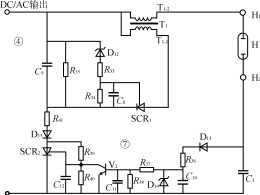 圖6金鹵燈點(diǎn)亮電路④和點(diǎn)亮起動(dòng)電路⑦ S2、S3的控制電壓是由反饋繞組T2-3提供的。這樣,所產(chǎn)生的正弦電壓經(jīng)次級(jí)繞組T2-2輸出。圖5(b)為該高頻變換電路工作時(shí)的部分電壓波形:上半部分為輸入電壓Vin和扼流圈L2的電壓VL2;下半部分有兩種電壓,一種是用虛線表示的,為S2或S3的偏置電位VB,另一種是S2或S3的柵極電壓VG。 加到S2及S3上的偏壓VB是取自扼流圈L2之后,S2、S3導(dǎo)通時(shí)VL2的波形是全波整流波形,因此,偏置電位VB波形的波谷就對(duì)應(yīng)于電壓VL2的波谷。這樣該偏置電位VB的短暫降落,使S2或S3變成截止?fàn)顟B(tài),阻止了因輸入電壓Vin的變化導(dǎo)致S2、S3都處于導(dǎo)通狀態(tài)的情況,從而保證了DC/AC變換的穩(wěn)定運(yùn)行。 (9)燈的點(diǎn)亮起動(dòng)電路⑦及點(diǎn)亮電路④ 圖6上部分為點(diǎn)亮電路④,下部分為點(diǎn)亮起動(dòng)電路⑦,其工作過程如下: 當(dāng)開關(guān)K剛合上,金鹵燈尚未點(diǎn)亮前,電路⑦中的電容C1的端電壓是零,晶體管V2截止。因此,晶閘管SCR2處于導(dǎo)通狀態(tài)。于是,電路④中的電容C9就被電路③的輸出電壓逐漸充電。電容C9的端電壓由D12、R33、R34構(gòu)成的電路來檢測。當(dāng)電容C9上的端電壓上升到使穩(wěn)壓管D12導(dǎo)通時(shí),晶閘管SCR1被觸發(fā)導(dǎo)通,電容C9就通過升壓變壓器T1的初級(jí)繞組T1-1放電,并在次級(jí)繞組T1-2中感應(yīng)出高壓脈沖疊加在電路③輸出的高頻正弦電壓上,這種合成的高壓加到金鹵燈H的電極H1及H2上,使金鹵燈點(diǎn)亮,接著燈電流給C1充電到預(yù)定電平,使晶體管V2導(dǎo)通,使SCR2關(guān)斷,C9充電中斷,從而就終止了點(diǎn)亮起動(dòng)脈沖的產(chǎn)生。 (10)異常狀態(tài)檢測電路⑩ 電路⑩對(duì)于諸如金鹵燈H正常老化,壽命到期,不能發(fā)光,或電路③輸出級(jí)開路等異常狀態(tài)均可檢測出。并將此異常狀態(tài)信號(hào)送到電路①,使繼電器觸點(diǎn)Ja斷開,并人為地把燈開關(guān)K暫時(shí)關(guān)斷,待故障排除后,把電源開關(guān)合上,再起動(dòng)工作。