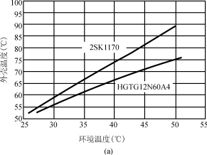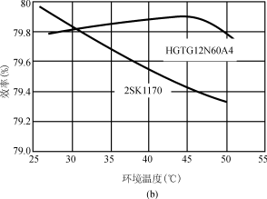 圖2在105kHz、450W雙開關(guān)正向變換器中,分別用HGTG12N60A4和2SK1170作為開關(guān)時(shí)外殼溫度及效率對(duì)比曲線 (a)外殼溫度(b)效率