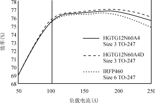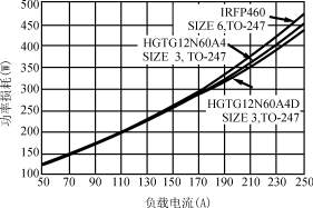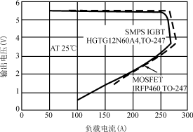 圖6在50℃環(huán)境溫度下,SMPSIGBT與MOSFET功率損耗比較 用。對(duì)于SMPS來講,高壓功率MOSFET的體二極管開關(guān)特性是非常重要的。MOSFET的體二極管反向恢復(fù)特性是不良的。在MOSFET的導(dǎo)通開關(guān)損耗中,其體二極管扮演著重要的角色,它將使EMI/IRI、電流振鈴和在di/dt上的電壓尖峰進(jìn)一步惡化。由于變壓器存在較大的漏感,為阻止MOSFET的體二極管導(dǎo)通,不得不在每只MOSFET漏極上串接一只肖特基二極管(CR2、CR3、CR10和CR11)。與此同時(shí),還要在每只肖特基二極管兩端分別并接一只齊納二極管(CR1、CR18、CR8和CR9),以保護(hù)肖特基二極管不被擊穿。此外,還要連接反并聯(lián)(anti?parallel)二極管(CR5、CR4、CR6和CR7)。 如果用3號(hào)尺碼(size3)芯片的HGTG12N60A4或內(nèi)裝有續(xù)流二極管的HGTG12N60A4D(Co?packSMPSIGBT),分別替代全橋變換器中6號(hào)尺碼(size6)的IRFP460(如圖4所示),共可以節(jié)省12支二極管(每只SMPSIGBT節(jié)省3支二極管),從而使系統(tǒng)成本降低20%。 全橋變換器DC輸入電壓為373V,開關(guān)頻率是60kHz。關(guān)于系統(tǒng)有關(guān)參量的測(cè)量,必須采用精度足夠的相應(yīng)儀表。在電源通風(fēng)入口及出口,可以安裝熱電耦用來測(cè)量工作環(huán)境溫度。安置在器件上的熱電耦用作測(cè)量管殼(case)溫度。在測(cè)試過程中,電源負(fù)載電流從50A到250A,環(huán)境溫度分別為25℃和50℃。每一種情況的測(cè)量,要求30分鐘的穩(wěn)定時(shí)間間隔。圖5示出的是全橋變換器在60kHz和50℃的環(huán)境溫度下,兩種SMPSIGBT與MOSFET最高管殼溫度隨負(fù)載電流變化的對(duì)比曲線。在250A的負(fù)載電流下,HGTG12N60A4D的管殼溫度與IRFP460比較,至少降低22℃。圖6為在50℃環(huán)境溫度下,分別用SMPSIGBT與MOSFET作為開關(guān)時(shí)的電源損耗比較曲線。在250A的滿載電流下,SMPSIGBT的功率損耗較MOSFET有5%~7%的降低,同時(shí)效率(POUT/PIN)提高1?32%以上,如圖7所示。 在過載條件下,負(fù)載電阻可以設(shè)定在0.02Ω到0.006Ω。全橋變換器在25℃的通風(fēng)入口溫度下,穩(wěn)定15分鐘,取得測(cè)試數(shù)據(jù)。在過載條件下,輸出電壓隨負(fù)載電流變化的折背(fold?back)響應(yīng)曲線比較如圖8所示。圖9為在折背響應(yīng)期間,SMPSIGBT與MOSFET管殼溫度比較曲線。