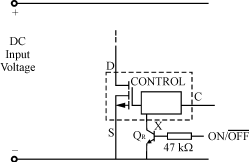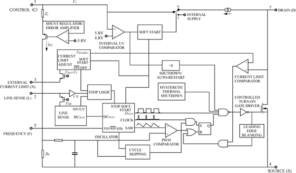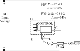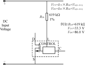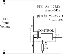 圖2??? 外形圖 ??? 下面介紹一下各功能的實(shí)現(xiàn)。 ??? 頻率選擇??? 將腳5與腳4短接,工作頻率為400kHz;將腳5與腳1短接,工作頻率為300kHz,腳5不能懸空。 ??? 輸入過(guò)欠壓檢測(cè)??? 輸入欠壓保護(hù)的作用是使輸入電壓達(dá)到設(shè)定值時(shí),芯片才開始工作,防止誤觸發(fā);過(guò)壓保護(hù)則是保護(hù)電路輸入部分,不會(huì)因輸入電壓過(guò)高而損壞,見(jiàn)圖3。 ??? 可編程電流限制??? 將一電阻RIL接于腳3與腳4之間,就可實(shí)現(xiàn)對(duì)內(nèi)部功率MOSFET漏極電流的限制,防止因輸出過(guò)流或短路引起的損壞,見(jiàn)圖4。 ??? ON/OFF開關(guān)控制??? 可實(shí)現(xiàn)對(duì)芯片的開關(guān)控制,腳3若懸空則芯片停止工作,見(jiàn)圖5;若在三極 管集電極接一電阻,就可實(shí)現(xiàn)電流限制,見(jiàn)圖6。 ??? 外部時(shí)鐘同步??? 是指用一外部時(shí)鐘信號(hào)控制芯片工作頻率,見(jiàn)圖7。 ??? 軟啟動(dòng)及關(guān)斷自動(dòng)重啟動(dòng)??? 軟啟動(dòng)功能是在電源開啟時(shí),防止浪涌電流過(guò)大而損壞內(nèi)部功率MOSFET及防止變壓器飽和;自動(dòng)重啟動(dòng)功能是在電路工作不正常時(shí),使芯片處在一種低功耗的保護(hù)狀態(tài),恢復(fù)正常后使電路重新啟動(dòng)。
