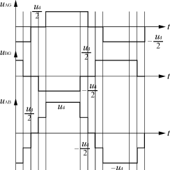 圖1??? TL整流器主電路 ??? 以左半橋臂為例,1態(tài)時,當電流is為正值時,電流從A點流經(jīng)VD11及VD12到輸出端;當is為負值時,電流從A點流經(jīng)V11及V12到輸出端,因此,無論is為何值,均有uAG=uCG=+ud/2,D1防止了電容C1被V11(VD11)短接。同理,在0態(tài)時,有uAG=0;在-1態(tài)時,有uAG=uDG=-ud/2,D2防止了電容C2被V22(VD22)短接。 ??? 右半橋臂原理類似,因此A及B端電壓波形如圖2所示,從而在交流側(cè)電壓uAB上產(chǎn)生五個電平:+ud,+ud/2,0,-ud/2,-ud。