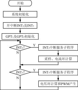 圖4??? 控制框圖 ??? 鎖相環(huán)電路產(chǎn)生一個與電源電壓同相位的單位正弦波形,ud的采樣信號通過低速電壓外環(huán)調(diào)節(jié)器進行調(diào)節(jié),電流is的采樣信號通過高速電流內(nèi)環(huán)G1進行調(diào)節(jié),電容C1端直流電壓u1與電容C2端直流電壓u2分別通過兩個PI調(diào)節(jié)器進行調(diào)節(jié),補償環(huán)G2用于補償兩只電容電壓的不平衡。 ??? 檢測的線電流命令is與參考電流is*比較,產(chǎn)生的電流誤差信號送至電流內(nèi)環(huán)G1,以跟蹤電源電流變化,產(chǎn)生的線電流波形將與主電壓同相位。 3??? 軟件設(shè)計 ??? 系統(tǒng)采用兩個通用定時器GPT1及GPT2來產(chǎn)生周期性的CPU中斷,其中GPT1用于PWM信號產(chǎn)生、ADC采樣和高頻電流環(huán)控制(20kHz),GPT2用于低頻電壓環(huán)的控制(10kHz),兩者均采用連續(xù)升/降計數(shù)模式。低速電壓環(huán)的采樣時間為100μs,高速電流環(huán)采樣時間為50μs。中斷屏蔽寄存器IMR,EVIMRA和EVIMRB使GPT1在下降沿和特定周期產(chǎn)生中斷,GPT2則僅在下降沿產(chǎn)生中斷。 ??? 整個程序分為主程序模塊、初始化模塊、電流控制環(huán)計算模塊、電壓控制環(huán)計算模塊、PWM信號產(chǎn)生模塊等五大部份。程序流程如圖5所示。