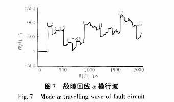 ??? 現(xiàn)在對(duì)以上仿真結(jié)果進(jìn)行分析如下:在圖5-8中的行波波頭1對(duì)應(yīng)故障點(diǎn)行波在雙回線M端母線第一個(gè)反射波到達(dá)測(cè)點(diǎn)的時(shí)刻;波頭2、3、4對(duì)應(yīng)M背側(cè)線路末端的第一、二、三個(gè)反射波到達(dá)測(cè)點(diǎn)的時(shí)刻;波頭5對(duì)應(yīng)故障點(diǎn)在N側(cè)母線的第一個(gè)反射波達(dá)測(cè)點(diǎn)的時(shí)刻;波頭6分別對(duì)應(yīng)故障點(diǎn)與M側(cè)母線間的第二個(gè)反射波到達(dá)測(cè)點(diǎn)的時(shí)刻、波頭5在M背側(cè)線路末端的第一個(gè)反射波到達(dá)測(cè)點(diǎn)的時(shí)刻、波頭5在N背側(cè)線路末端的第一個(gè)反射波到達(dá)測(cè)點(diǎn)的時(shí)刻,三者極性相同,互相疊加;波頭7、8、9分別對(duì)應(yīng)波頭5在M和N背側(cè)線路末端的第二、三、四個(gè)反射波到達(dá)測(cè)點(diǎn)的時(shí)刻,由于M和N的背側(cè)線路都為10公里,所以二者總是同時(shí)到達(dá),且極性相同、互相疊加;波頭10、12分別對(duì)應(yīng)波頭1在M端和N端母線間經(jīng)第一、二次反射后,到達(dá)M端測(cè)點(diǎn)的時(shí)刻;波頭11、13分別對(duì)應(yīng)波頭5在M端和N端母線間經(jīng)第一、二次反射后,到達(dá)M端測(cè)點(diǎn)的時(shí)刻。
